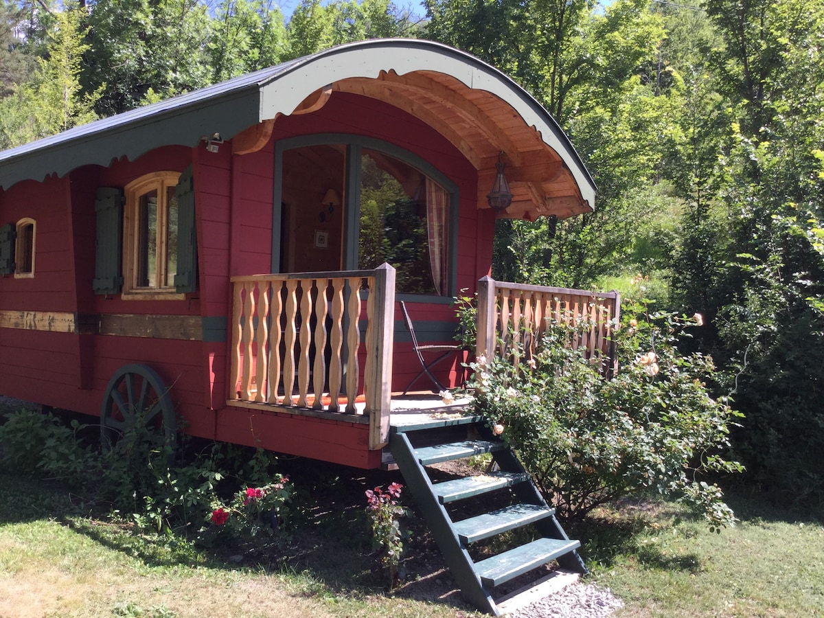 roulotte pouvant accueillir 1 couple dans un vrai lit alcove et eventuellement un enfant sur un lit futon. Tout le confort moderne : micro onde, four, frigo, machine à laver, salle de bain, toilette, internet. Vue imprenable sur les montagnes du Morgon et de Dormillouse. Possibilité de pratiquer à proximité parapente, sports d'eau sur le lac de serre ponçon, sports de rivière eau vive, VTT de descente à la station de st jean montclar, randonnée, VTT vélo de route. Calme et tranquilité !!
