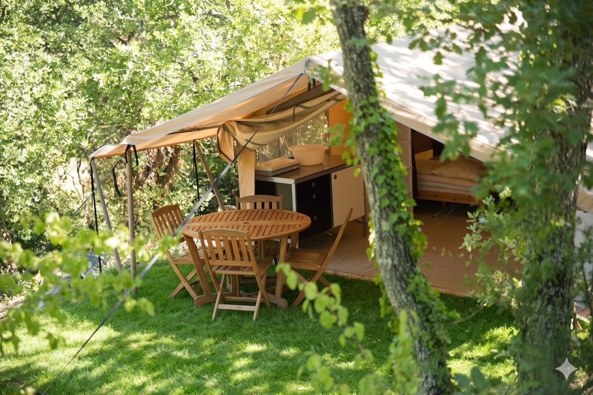 Tienda equipada, bajo las estrellas con una vista panorámica excepcional, en una terraza, alojamiento para dormir de 2 a 4 personas. Magnífica ubicación en medio de la naturaleza, vista abierta mitad sombra/mitad sol, orientación sur - suroeste. Terraza amueblada, aseo seco, ducha solar, zona de cocina. Aproveche la naturaleza, los cantos de los pájaros, el vuelo de las aves rapaces, en armonía con el medio ambiente, cerca de las "señoritas coronadas" de Thèus, Mont Colombis Acceso en coche.