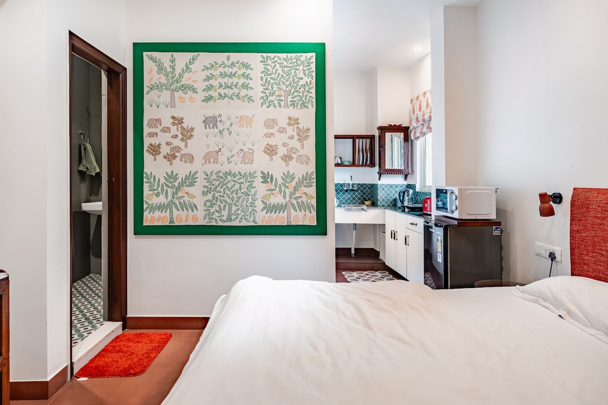 Deléitate con el encanto atemporal de nuestro apartamento de un dormitorio, diseñado con el encantador estilo rayastaní. Ubicada en el corazón de Delhi, justo delante del monumento Hauz Khas del siglo XIII y el animado pueblo de Hauz Khas, esta morada independiente ofrece una mezcla única de historia y vitalidad contemporánea. El tamaño del apartamento es de 480 pies cuadrados.