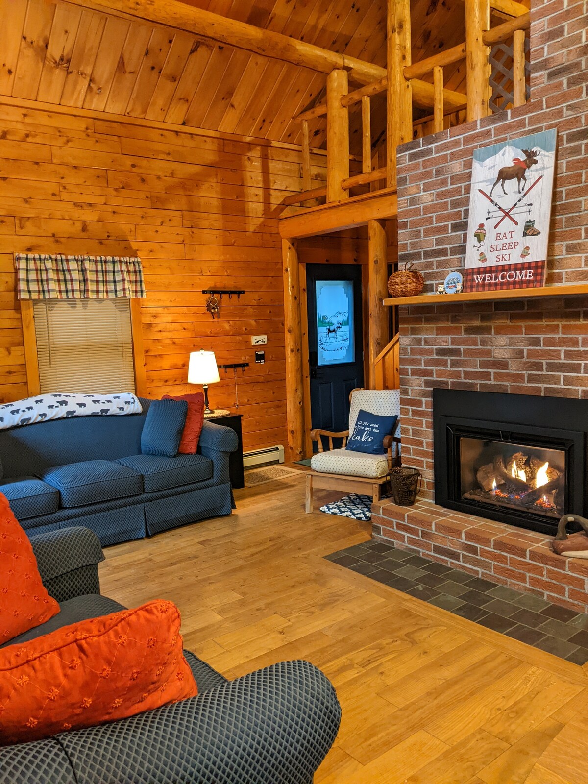 ¡Esta adorable casa de troncos privada es perfecta para tu escapada! Hay una cama de madera tamaño queen en el dormitorio del primer piso y un futón de tamaño completo en el acogedor loft. La casa tiene un baño espacioso con ducha a ras de suelo y lavadora/secadora. Disfruta de una cocina rústica totalmente equipada. Hay 3 televisores grandes de pantalla plana, Internet de 100 Mbsp con Roku, servicio telefónico local y de larga distancia gratuito y acceso a una comunidad junto al lago con parque infantil, playa, piscina, tenis, senderos y senderos para motos de nieve.