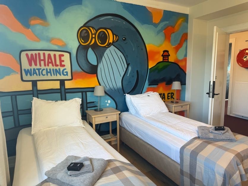 Our peaceful, orca-themed apartment offers a spectacular view over Grundarfjörður and famous Mt. Kirkjufell. In the summer you can watch colorful sunsets and in the wintertime witness the Northern lights in clear skies. The apartment is detached from the main building and includes a well-equipped kitchen (yes, there's coffee and tea), a private bathroom, as well as comfortable beds and a seating area for two people. Supermarket, clinic, swimming pool, and waterfront in walking distance.