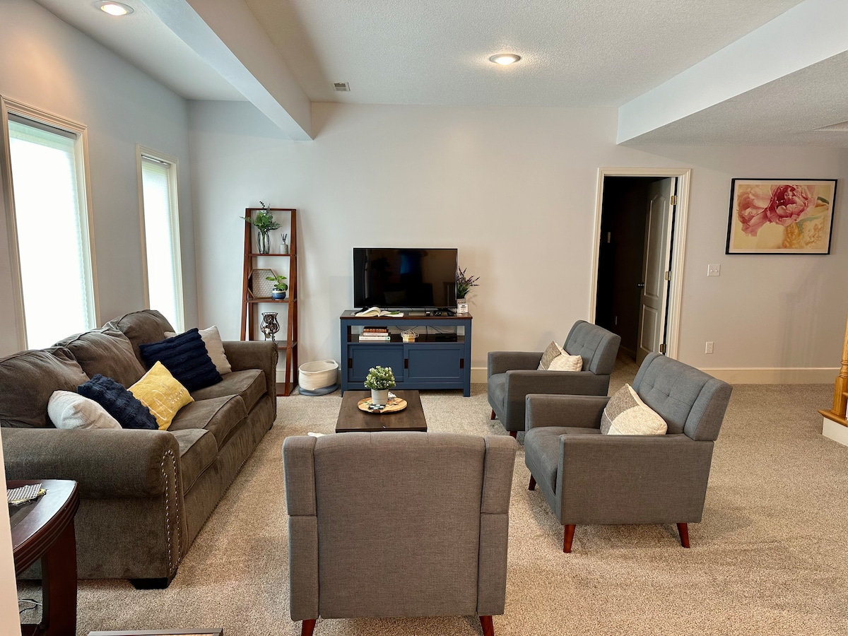 Este apartamento recién remodelado en el sótano de dos dormitorios con sala de estar, baño completo y cocina pequeña se encuentra a las afueras de Kansas City. Relájate y recarga energías en el país sin dejar de tener un acceso rápido y fácil a lo que te trae aquí. Una cama tamaño king en una habitación y una litera triple más una doble en la otra. Nuestro espacio es perfecto para 6 personas. ¡Nos encanta anfitrionar a familias con niños!