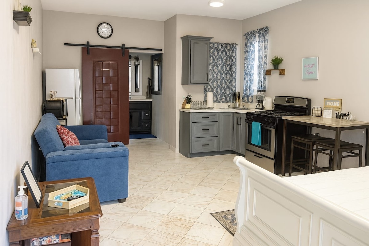 Relax in complete comfort at this fully furnished, self contained, upper studio apartment. Suitable for 2 adults and one kid. Private entrance, washer/dryer included, access to outdoor patio relaxation, secured parking, fenced property. Wi-Fi, Netflix.