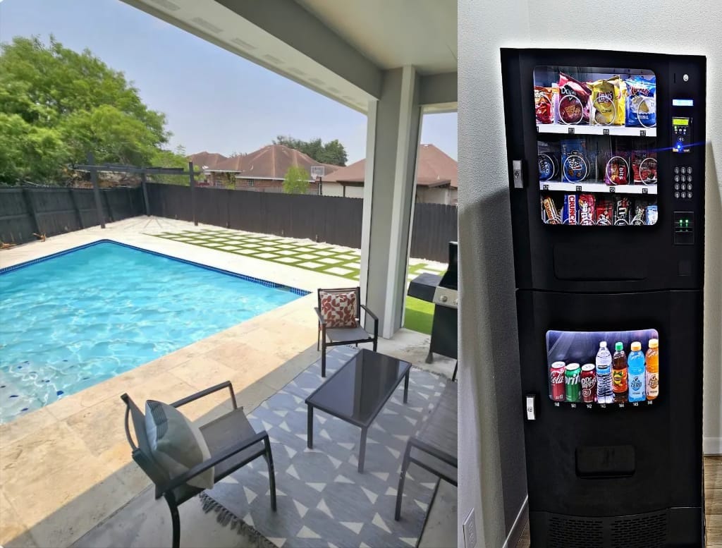 Máquina expendedora y piscina. Oasis Getaway 3BR, 5 camas