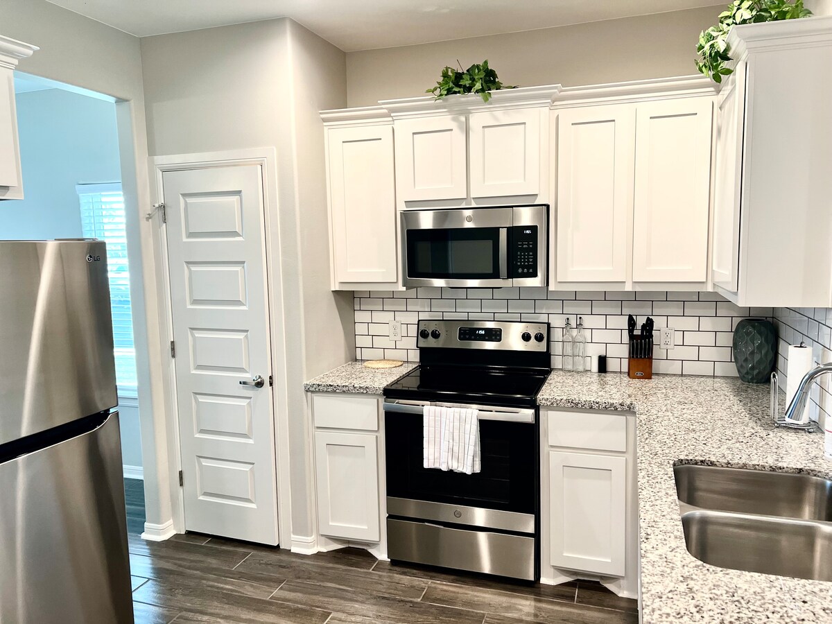 Keep it simple at this peaceful and centrally-located place. Enjoy a few nights at this cute, fun 3 bedroom, 2 bath home. Located minutes from Chilis, Canes, Suerte, McDonalds, Chick Fil A, Dutch Bros, Tropical Smoothie Cafe, Shake Express, Wing Snob, Wingstop, Siempre Natural, HEB, Wal-Mart, TJ-Maxx, Target, Movies, and many more. Enjoy a nice BBQ or watch the hottest sports game in the outdoor space. This home is equipped with everything you need to make your stay worthwhile and comfortable!