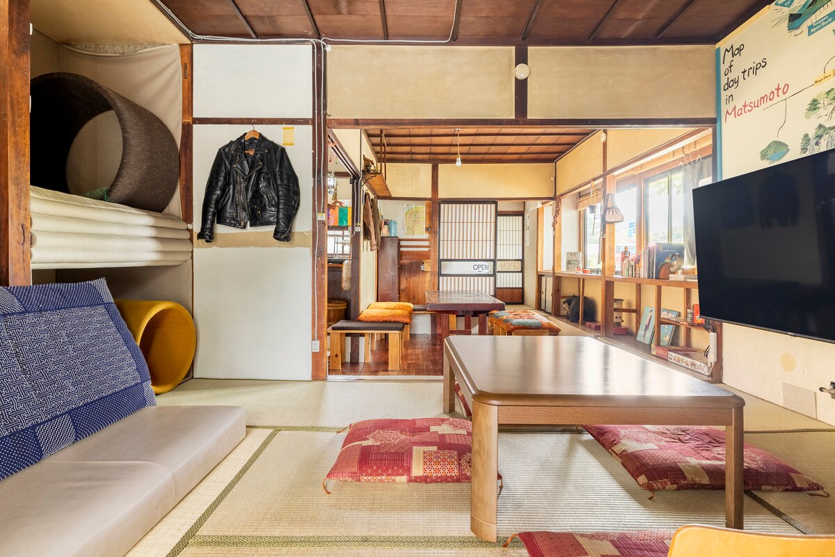Popotel one es una casa centenaria situada frente al castillo de Matsumoto y decorada con antigüedades procedentes de todo el mundo. La casa, con tres dormitorios y capacidad para 12 personas, es un espacio cómodo y cuidadosamente mantenido. Disfruta de una estancia relajante en una casa donde conviven el encanto de otros países y la tranquilidad de Japón. La casa es tranquila y recibe mucha luz solar. El salón, el patio y los dormitorios están diseñados para que puedas pasar el día cómodamente en cualquier lugar. Las antigüedades de todo el mundo que se encuentran aquí y allá crean un ambiente único donde se cruzan el tiempo y el espacio. Las instalaciones como el baño y la cocina son antiguas, pero se han mantenido con cuidado. Disfruta de la vida tradicional japonesa. Hay tres habitaciones diferentes, una habitación con una litera grande muy popular entre los niños y una habitación japonesa con vistas al castillo de Matsumoto. ¡Encuentre su habitación favorita! Matsumoto es una ciudad compacta y con historia. Además de los lugares turísticos como el castillo de Matsumoto, también hay cafés y restaurantes populares entre los jóvenes, por lo que podrá disfrutar de un agradable paseo por la ciudad. ¡También recomendamos experimentar la cultura de los baños japoneses en un baño público a solo 3 minutos a pie de la casa! No dude en ponerse en contacto con nosotros.
