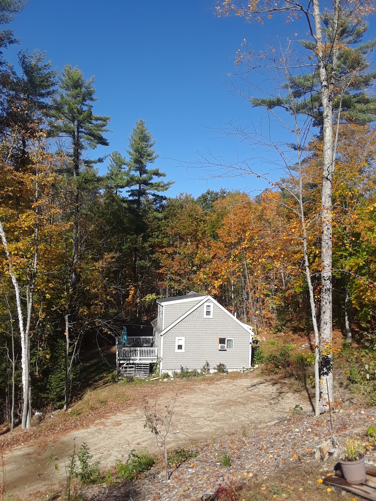 ¡Escápate a una casa de ensueño con estructura de madera escondida en los bosques de Maine! Te esperan vigas elevadas, pisos con calefacción radiante, una cama loft tamaño king y una chimenea crepitante. Toma un café en una de las dos terrazas, camina por la montaña Bradbury (a 3 minutos), compra en Freeport (a 10 minutos) o cena en Portland (a 20 minutos) y luego regresa a tu acogedor refugio bajo las estrellas. Cocina completa, techos abovedados, pisos de calor radiante, entrada privada, fogata y vistas tranquilas al bosque lo convierten en el refugio perfecto durante todo el año.