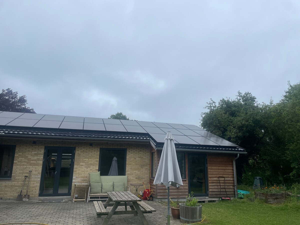 Esta perla natural se encuentra al norte de Helsinge en el norte de Zelanda de los reyes con vistas a los campos abiertos y bosques. Hay 200 m. al bosque donde hay buenas posibilidades de ir a la caza de hongos o simplemente dar un paseo en la hermosa naturaleza. Es muy común que los animales del bosque pasen justo fuera de las ventanas. Por ejemplo, pueden ser ciervos, gamos y corzos. Puedes cargar tu coche eléctrico con nosotros. Tenemos un medidor de electricidad separado, por lo que se liquida de acuerdo con los precios diarios que se encuentran en otros puntos de carga públicos.