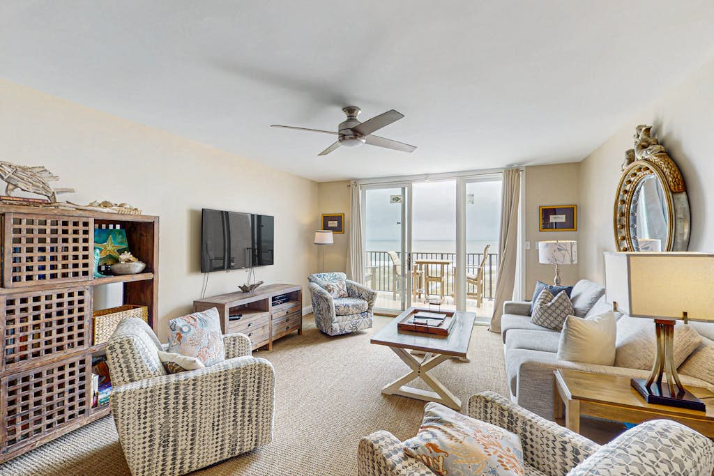Bright and cozy 3rd-floor beach retreat just a 3-minute walk to the sand! This 2BR/2BA condo features an open living area with a large TV, full kitchen, and private patio. Includes beach umbrella, 4 chairs, cooler, towels, toys, and 4 pickleball paddles. Enjoy resort trolley access and on-site bike rentals—perfect for a relaxing, easy getaway!