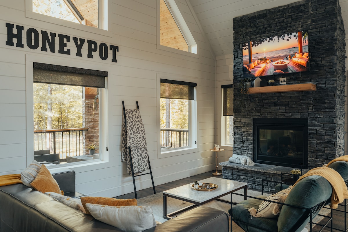 Bienvenido a Honey + The Bear, una cabaña de lujo situada en una ubicación perfecta. ¡Esta cabaña aislada tiene una gran terraza envolvente y un jacuzzi privado al aire libre! En el interior, te invitamos a acurrucarte junto a la chimenea de gas mientras ves tus programas favoritos en el gran televisor de alta definición. Prepara comidas en esta hermosa cocina personalizada equipada con todo lo que puedas necesitar. Los baños están construidos como un spa de 5 estrellas, con una gran bañera de inmersión y ducha a ras de suelo. ¡Ven a relajarte a nuestro pequeño pedazo de paraíso!