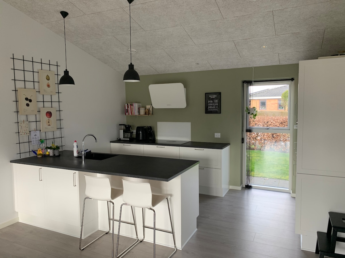Verdadero ambiente de casa de verano de 70 m2, terraza de madera de 50 m2 con sol de la tarde y la noche. Capacidad para 4-6 en 3 dormitorios: 1 cama doble y 2 3/4 camas. Se adapta muy bien para 4 personas, pero 6 se pueden exprimir si estás un poco cerca. Hay sábanas y toallas. Cocina completa, lavavajillas, wifi, TV inteligente, estufa de leña. Lavadora/secadora. Barrio tranquilo. Acceso al puente del barco en el lago Sunds justo enfrente de la zona de giro. 5 minutos al supermercado. 15 minutos a Herning.