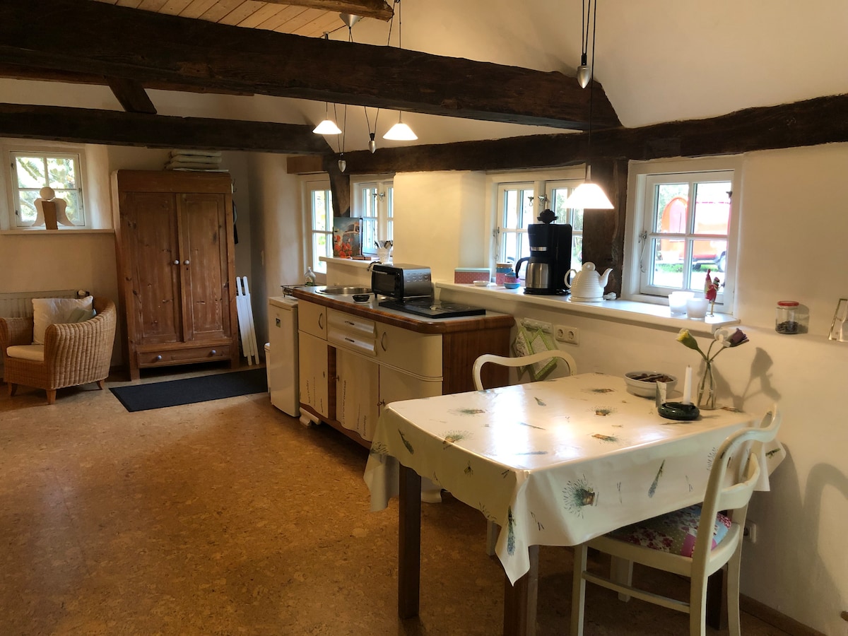 Die sonnige, Licht durchflutete Wohnung ″Scheunendiele″ liegt in einer ausgebauten Fachwerkscheune mit eigenem Garten und Sonnenterrasse. Geräumige 60 qm, Wohnzimmer mit offener, voll ausgestatteter Küche, bieten Raum für 2- 4 Personen. Der Essbereich ausgestattet für bis zu 4 Personen liegt neben dem Wohnbereich mit Couch und Sesseln und zusätzlicher Lese Ecke beim Kamin. Die beiden Schlafzimmer befinden sich in der oberen Etage, mit Blick in den wunderschönen Garten.