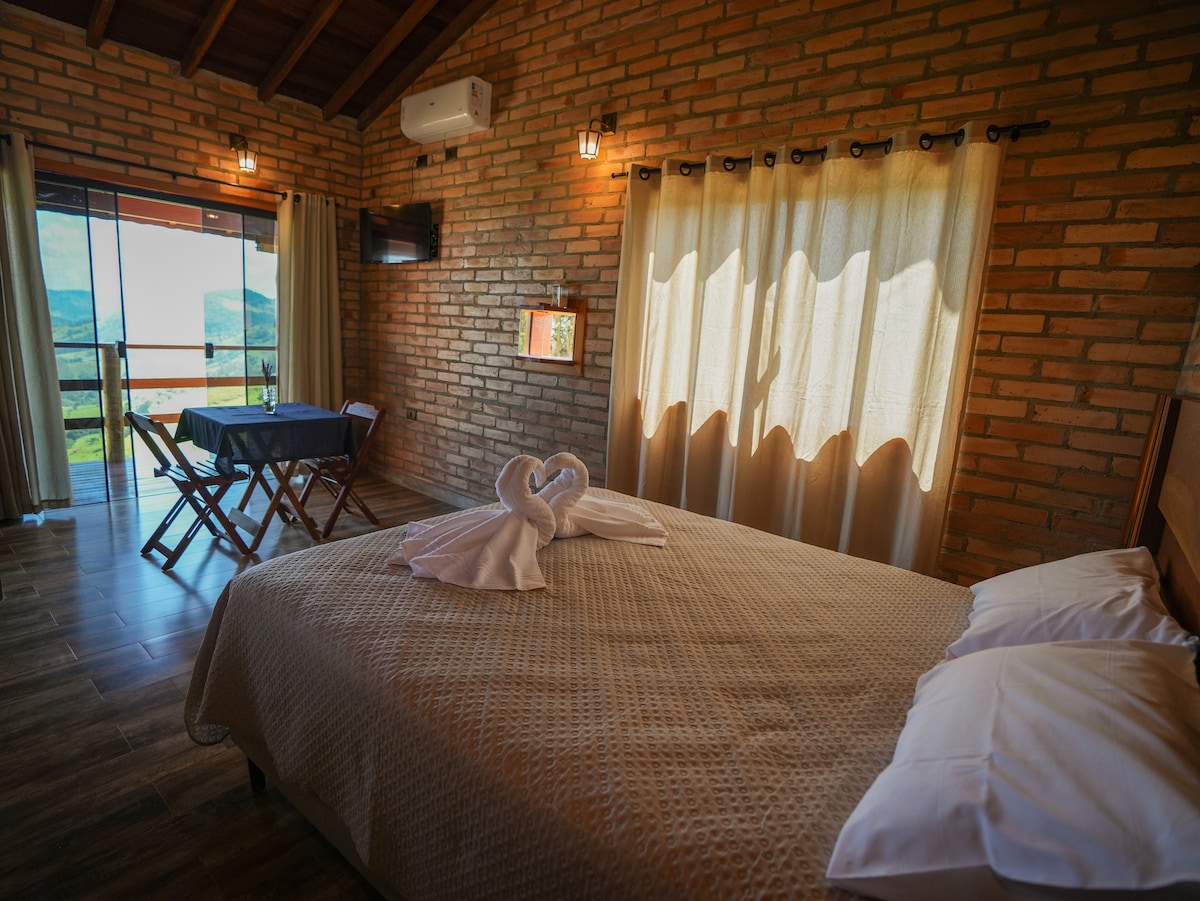 Localizado no alto da serra com uma vista de perder o fôlego, fornecemos café da manhã, opcional cobrado à parte, temos uma cama Queen, armário para malas, banheira de hidromassagem, janela de pássaros trazendo uma experiência única, ar condicionado quente e frio, TV32", WI-FI, banheiro privativo, cozinha completa, varanda de deck com cadeiras de rede. Cercado por natureza, com a vista das montanhas, o nascer do sol com os pássaros cantando e o céu estrelado à noite, uma experiência única!