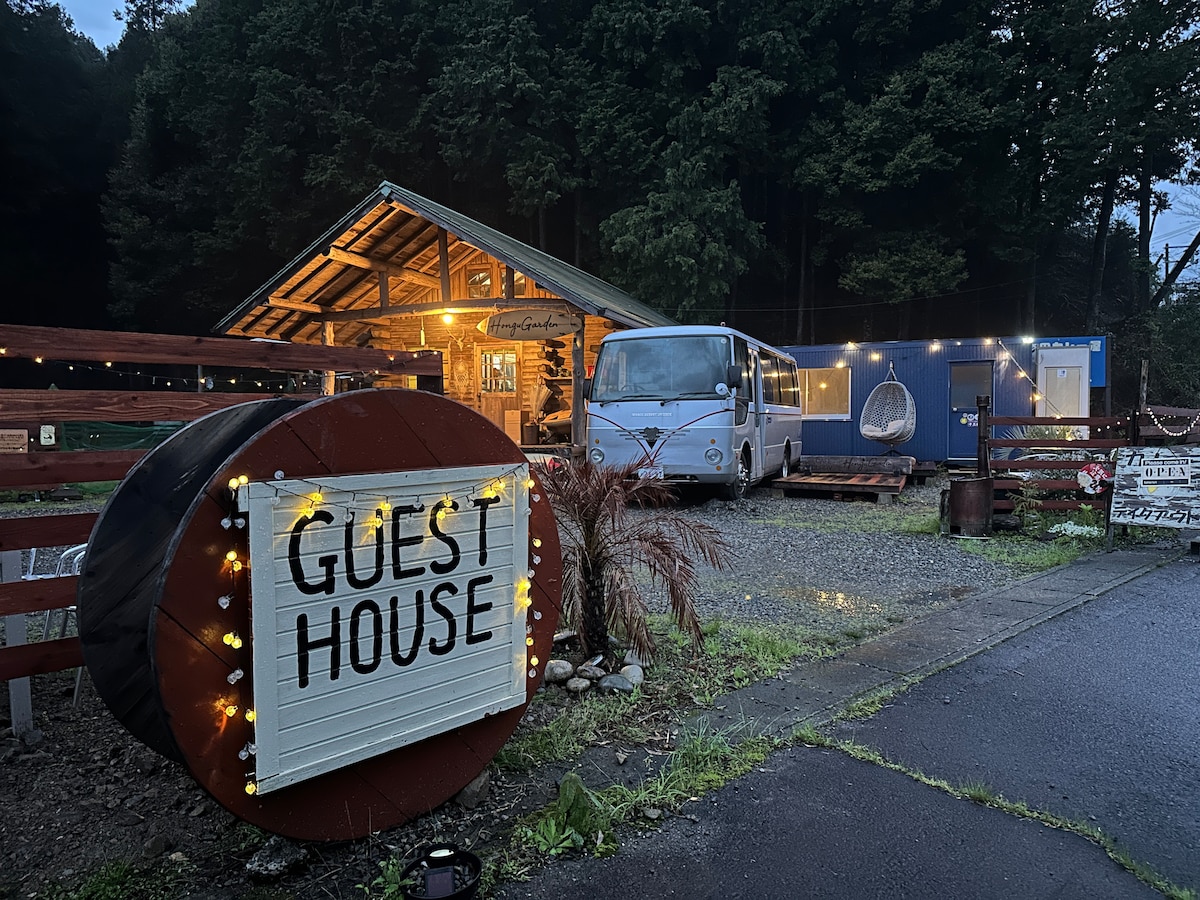 場所は本宮町内にあります。国道168号線沿い「高津橋」のバス停が目の前なのでアクセスは抜群です。 熊野本宮大社や湯ノ峰温泉、渡瀬温泉、川湯温泉へもバスや無料でお貸出しの自転車で行けます。 本宮から小口方面への熊野古道ハイキングにも最適な場所です。 自慢は、山に囲まれた広いお庭です。鳥や鹿の鳴き声が聞こえます。晴れた日は芝生でピクニックやサンベッドで日光浴は気持ち良いです。お子様向けの遊具もありますので、家族連れには最高に楽しい場所だとオススメします。 寝室は山小屋風にリフォームしたバス車内になります。 リビングルームとシャワールームとトイレは、それぞれ別棟になります。いずれも、他のお客様と共用施設になります。 せっかく遠い場所から本宮町に滞在されるのですから、大自然に囲まれた当館で思い出に残る素敵な宿泊と自然とのつながりを取り戻しましょう。 基本プランはご飯なしの素泊まりです。 ※別途オプションで、スタッフが滞在する日の限定ですが、夕食と朝食も提供可能です。 ※スタッフが滞在する日の限定ですが、別途有料オプションで送迎(本宮町内は1回1000円)や荷物の発送も可能です。
