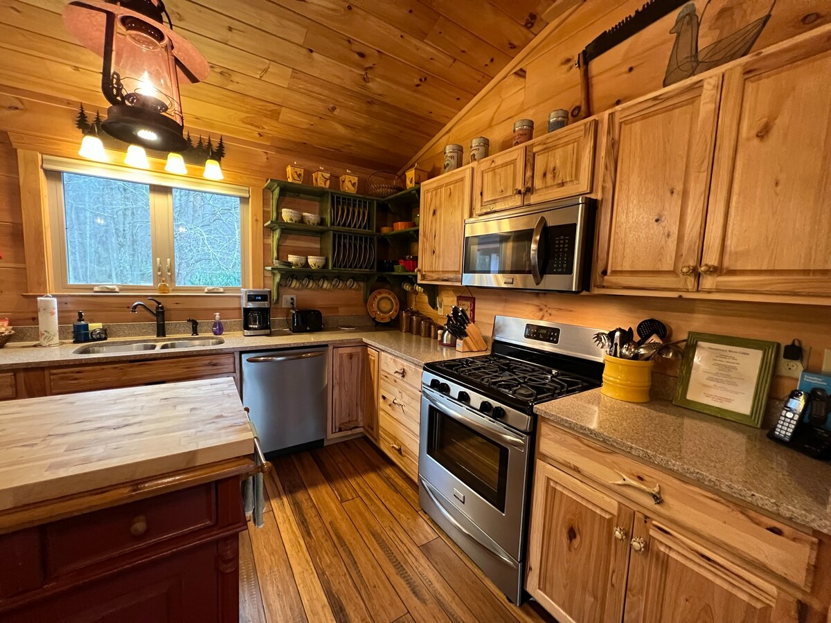 Private riverfront setting, yet a short stroll to The Appalachian Trail, downtown shops,, restaurants, brewery, and live music. The cozy Otter cabin has a fully equipped kitchen, comfortable living/dining area, king-sized bed in separate bedroom, and a large bathroom with walk-in tile shower and freestanding Japanese soaking tub. The round cabin design with wrap-around deck views put you in the heart of nature.