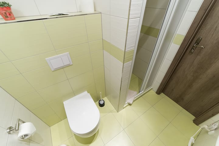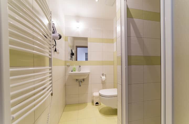 con cama doble, internet WIFI, hervidor de agua y minibar. La habitación doble tiene una hermosa vista del centro. La habitación tiene baño con ducha e inodoro. Habitación con vistas al centro de 17 m2.