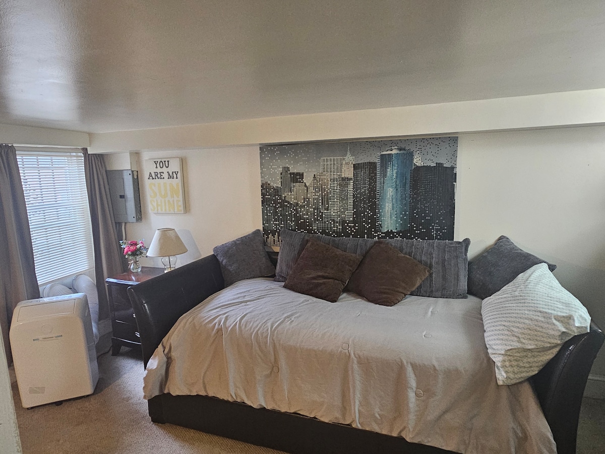 Espacio abierto perfecto para 1 o 2 huéspedes. Cómoda cama tamaño king, sofá, espacio de trabajo, mininevera, microondas, hervidor eléctrico y Keurig (pero no una cocina completa). Entrada privada, espacio en el sótano y baño privado. Cerca de fabulosos restaurantes/bares. A unos 15 minutos a pie de la línea verde del metro. Nota: Si bien la suite es privada y está cerrada a la casa principal, la casa tiene 2 gatos, una consideración para aquellos con alergias. Además, es una casa antigua y conectada con suelos originales y, por lo tanto, no insonorizada.