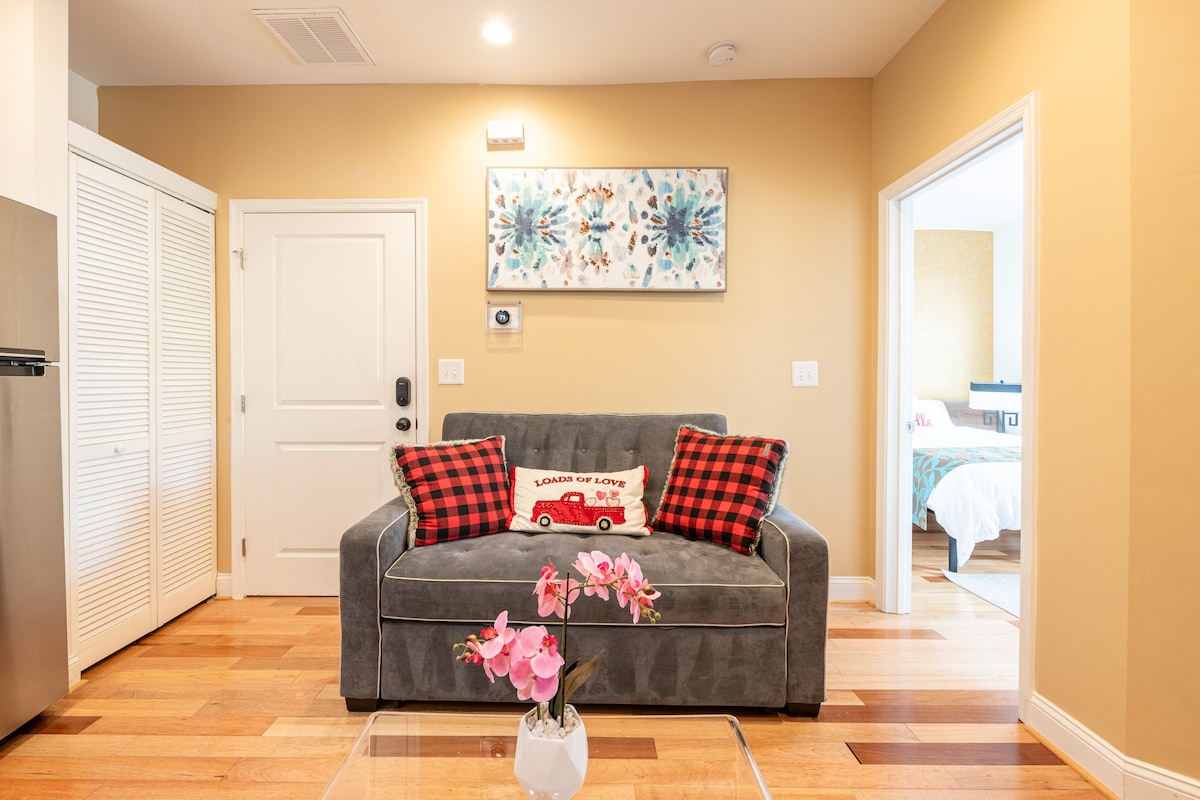 ¡Disfruta de un refugio en un apartamento en el sótano recientemente renovado en DC con estacionamiento gratuito en la calle y acceso conveniente a todo el bullicio del centro de la ciudad! Los servicios incluyen cerradura inteligente/alarma que permite el auto check-in/check-out; amplio dormitorio con cama tamaño queen Duxiana; sala de estar con cómodo sofá y televisor inteligente; moderno baño recién renovado; cocina completa con cafetera, hervidor de agua, nevera, estufa/horno y microondas; y lavadora/secadora.