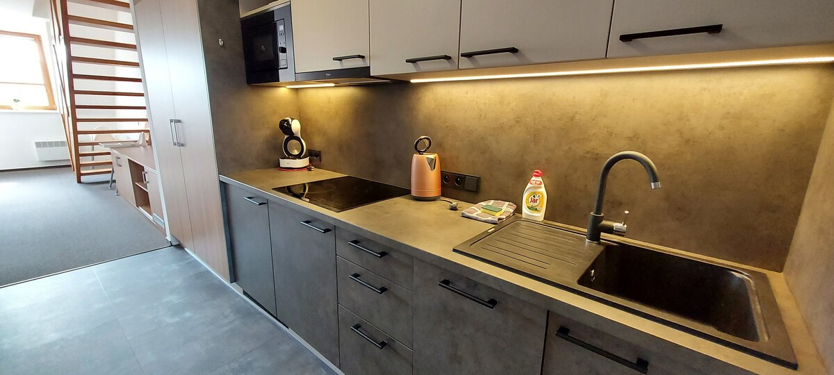 El apartamento Krakonoš es un alojamiento acogedor y lujosamente equipado de dos plantas en una cabaña de montaña de 35 m². Ofrece una zona de cocina totalmente equipada con cafetera Nespresso, horno y TV, baño con ducha grande. El dormitorio del ático tiene una cama doble + 1 cama supletoria. Gracias a su ubicación, combina paz y auténtico ambiente de montaña con acceso a pie al centro de Pec, Relax Park y el teleférico a Sněžka. El lugar perfecto para unas vacaciones relajantes y activas en las Montañas Gigantes.