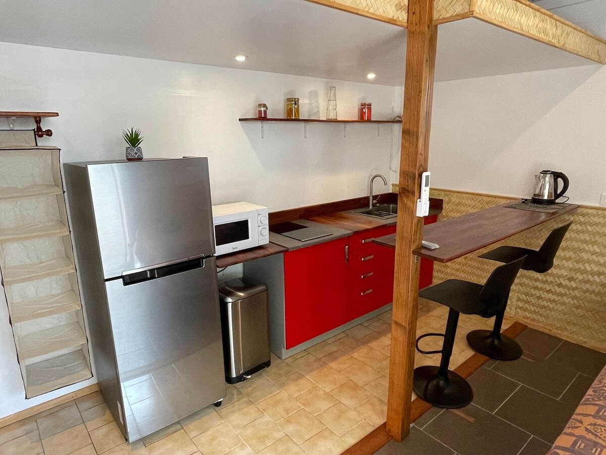 Ubicado en Fare, este estudio vacacional independiente está a pocos pasos de la playa de arena blanca más bonita de la isla, restaurantes y tiendas. Está totalmente equipado: TV de pantalla plana, wifi, horno, microondas, nevera, aire acondicionado. Hay un baño privado con ducha. Toallas y ropa de cama incluidas. Hay mosquiteros en las ventanas y en la puerta. El aeropuerto de Huahine está a 2 km del Fare Chili.
