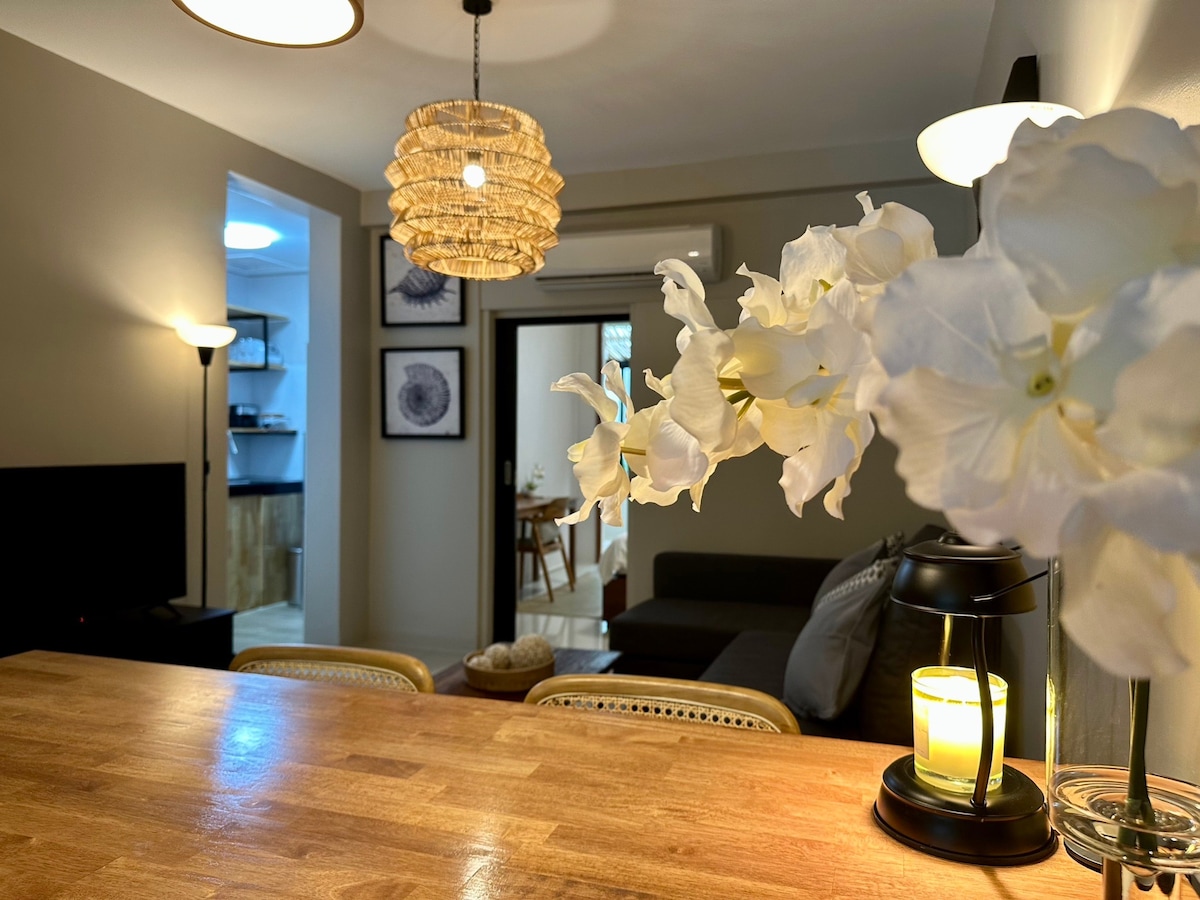 This beautiful Japanese-inspired 55 sqm unit has everything you need for a pleasant stay. The bedroom king-sized bed and personal workspace, and opens onto a spacious semi-outdoor bathroom with a wooden ofuro tub that fits two, and leads to a large walk-in closet. The living room includes a cozy sofa bed and a Ultra HD Smart TV. The kitchen is well-equipped with a microwave, range-hood, electric hob and refridgerator. The large picture window offers a view of the gardens and swimming pool.