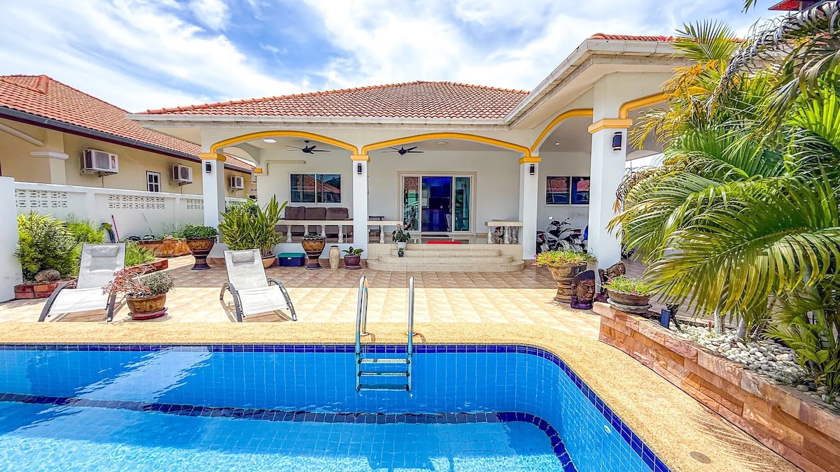 Nota: La entrada al dormitorio principal está separada de la sala de estar y tiene su propia puerta de acceso. Villa completa con piscina privada (área de chorro de jacuzzi en la esquina). - Baño privado con bañera y ducha de efecto lluvia. - Cocina. - 2 tipos de parrilla. - Área en la azotea con vista a la montaña. - 2 plazas de estacionamiento privado. - Sala de estar. Actividades: - A 5 minutos del parque acuático Black Mountain. - A 10 km de la zona central de Hua-Hin (a unos 15 minutos en auto). - A 5 minutos de 7-11 y del mercado nocturno Lunar.