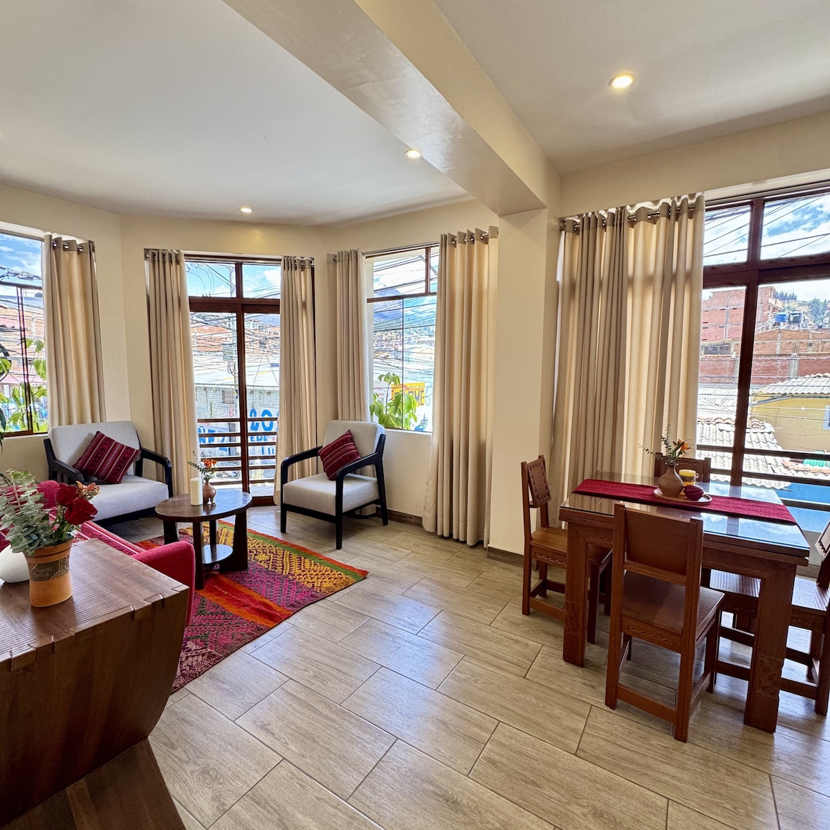 Apartamento con un paisaje único cerca a la iglesia de La Soledad, ubicación céntrica, tranquila y segura, tendrás fácil acceso a bodegas, restaurantes, cafeterías. Y llegarás en 10 min caminando a la plaza de armas. Cuentas con kitchenette, balcón a la calle, Wifi, TV Smart 50", baño con ducha, agua caliente en la ducha y lava trastes de cocina, menajeria, microondas y nevera. Perfecto para estadías largas. Tip: Pregunta por la disponibilidad de cochera gratuita
