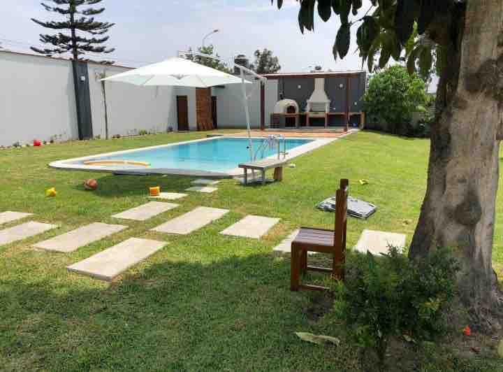 Esta moderna casa con jardín, completamente cercada y de 2,500 m2, se situa en un condominio privado con seguridad las 24 horas en Pachacamac, a solo 45 minutos de Lima. Con capacidad para hasta 12 personas, incluyendo un cuarto de servicio, la casa ofrece una piscina climatizable y una cámara de vapor. Los dormitorios están equipados con sábanas nuevas y edredones de plumas. Rodeada de naturaleza y con espectaculares vistas; es ideal para descansar sin alejarse de la ciudad y sus atracciones.