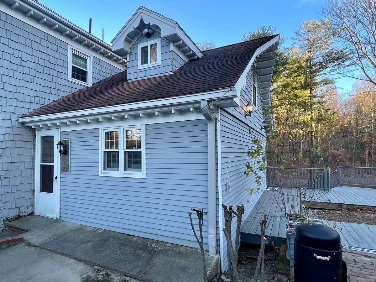 Suite privada con entrada independiente. Puerta cerrada con llave entre la suite y el alojamiento. Sala de estar con sofá de dos plazas, mesa/escritorio plegable de pared y sillas, TV y cocina americana. La cocina pequeña incluye mininevera, microondas, cafetera, hervidor de agua y tostadora. Dormitorio con cama tamaño queen. Baño nuevo. A 25 millas al oeste de Boston. A minutos de huertos de manzanas donde puedes recoger tus propias manzanas, bodegas, sidrerías y campos de golf. El patio trasero se conecta a senderos de tierra de conservación. A 3,3 millas de la estación de tren de S. Acton.