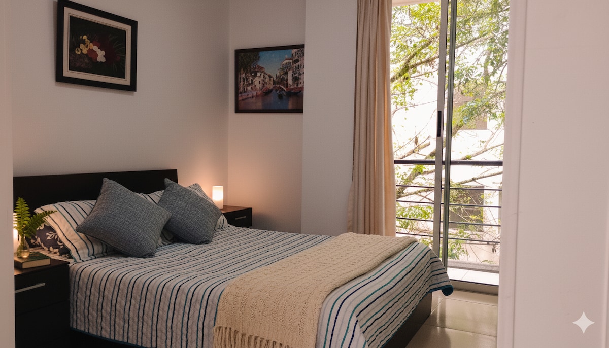 Moderno apartamento en Granada, el principal distrito cultural y gastronómico de Cali. Ubicado en el cuarto piso del elegante edificio Hayedo Juanambú, ofrece comodidad, un gran balcón con vistas a la ciudad, camas tamaño queen y aire acondicionado en ambas habitaciones. Sala de estar con sofá cama y ventilador de techo. Dos baños completos con agua caliente. Cocina totalmente equipada, lavadora y secadora. Wi-Fi de alta velocidad (300 Mbps), impresora, 3 televisores inteligentes. El dormitorio principal incluye vestidor, caja fuerte y acceso al balcón.