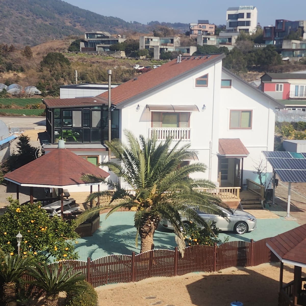 Hello. It is located on a cliff in the center of Seogwipo, so it has a perfect ocean view with permanent views. Our space is a private, small, detached space that is separate from other travelers, so guests can use it without ambient noise. Rooms are divided into bedrooms and living rooms with 20 pyeong, including rooms You can see the sea from the swimming pool, the cafe where you can have breakfast, and the outdoor garden.