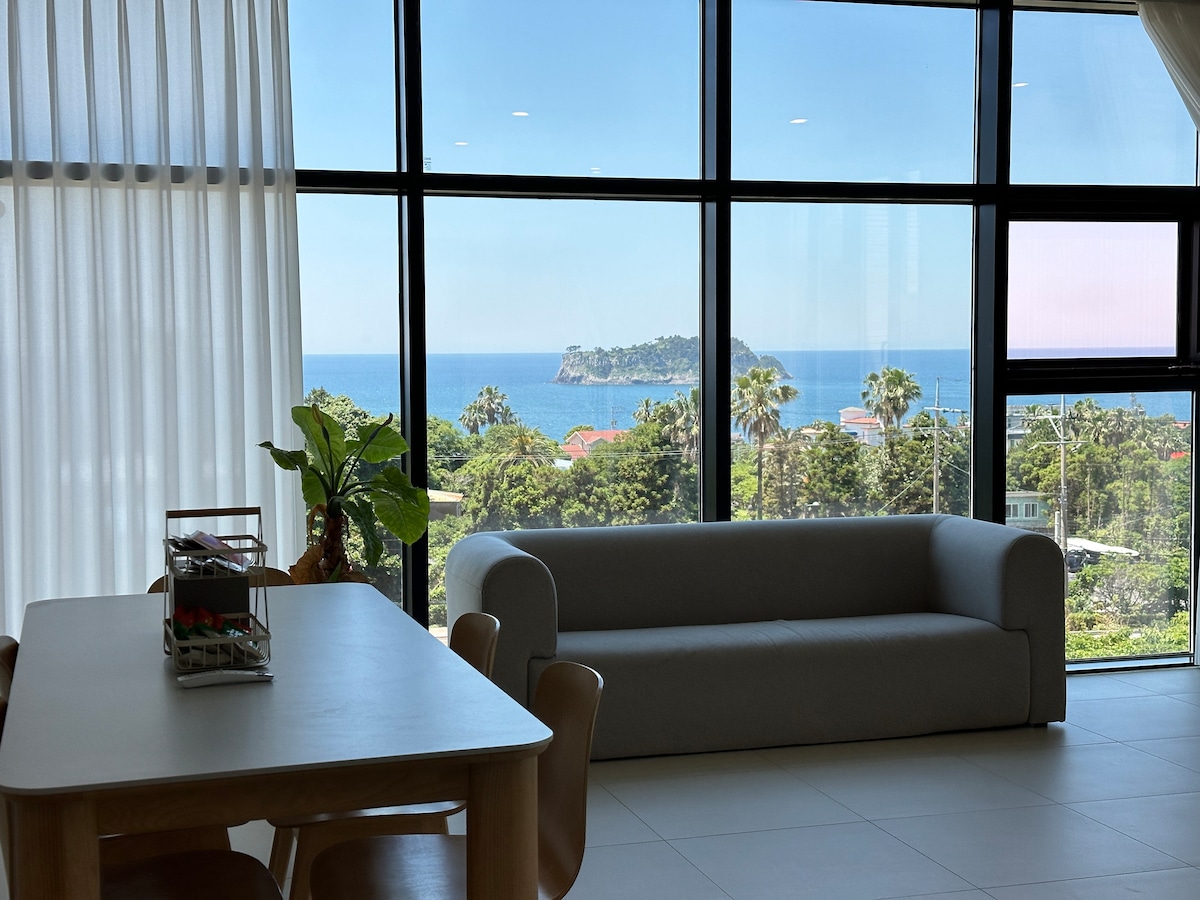 Hola. Ubicado sobre un acantilado en el centro de Seogwipo, este espacio ofrece vistas al océano y a las islas. Con 66㎡ garantiza privacidad y tiempo propio. Aunque es tipo estudio, el dormitorio, sala y cocina están claramente separados, brindando amplitud y comodidad. En la terraza podrá disfrutar del spa y de una barbacoa con vista al mar. Desayune frente al mar en la piscina infinita a diario. La piscina abre de mayo a octubre. El lounge ofrece desayuno gratuito con vistas a Beomseom.:)