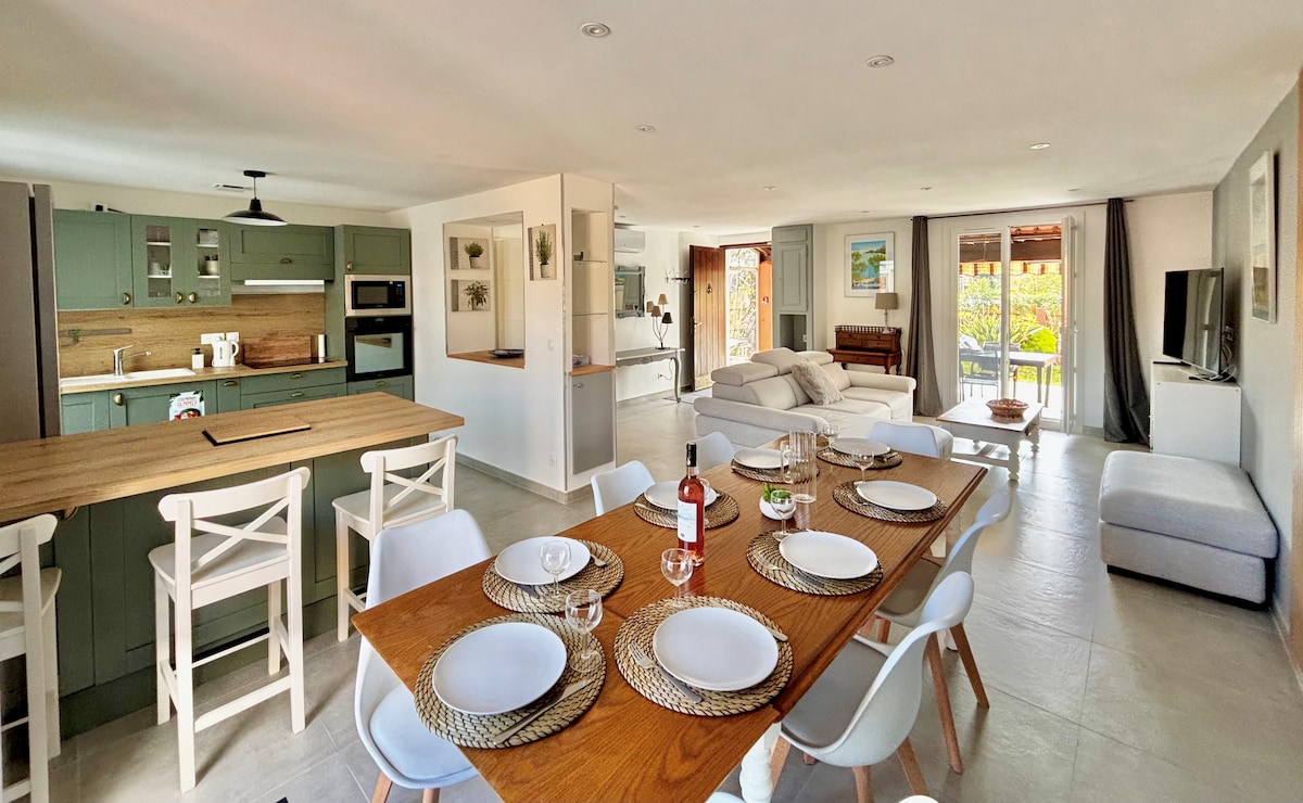 Relájate en este lugar pacífico, rodeado de naturaleza. Impresionante vista de las montañas (Les Maures) y el mar. A 5 minutos a pie de la reserva natural o piscina comunitaria/canchas de tenis/ping-pong/columpios (acceso gratuito). Recientemente renovado y totalmente climatizado/climatizado. Cuna vallada. Nueva cuna para bebés, cambiador y silla alta disponibles bajo petición. Playa cercana: 15 minutos en auto o 30 minutos en bicicleta. Espacio de oficina tranquilo con wifi. Ropa de cama y ropa de cama proporcionada. 7 en camas/dormitorios, 2 en sofá cama/sala de estar.