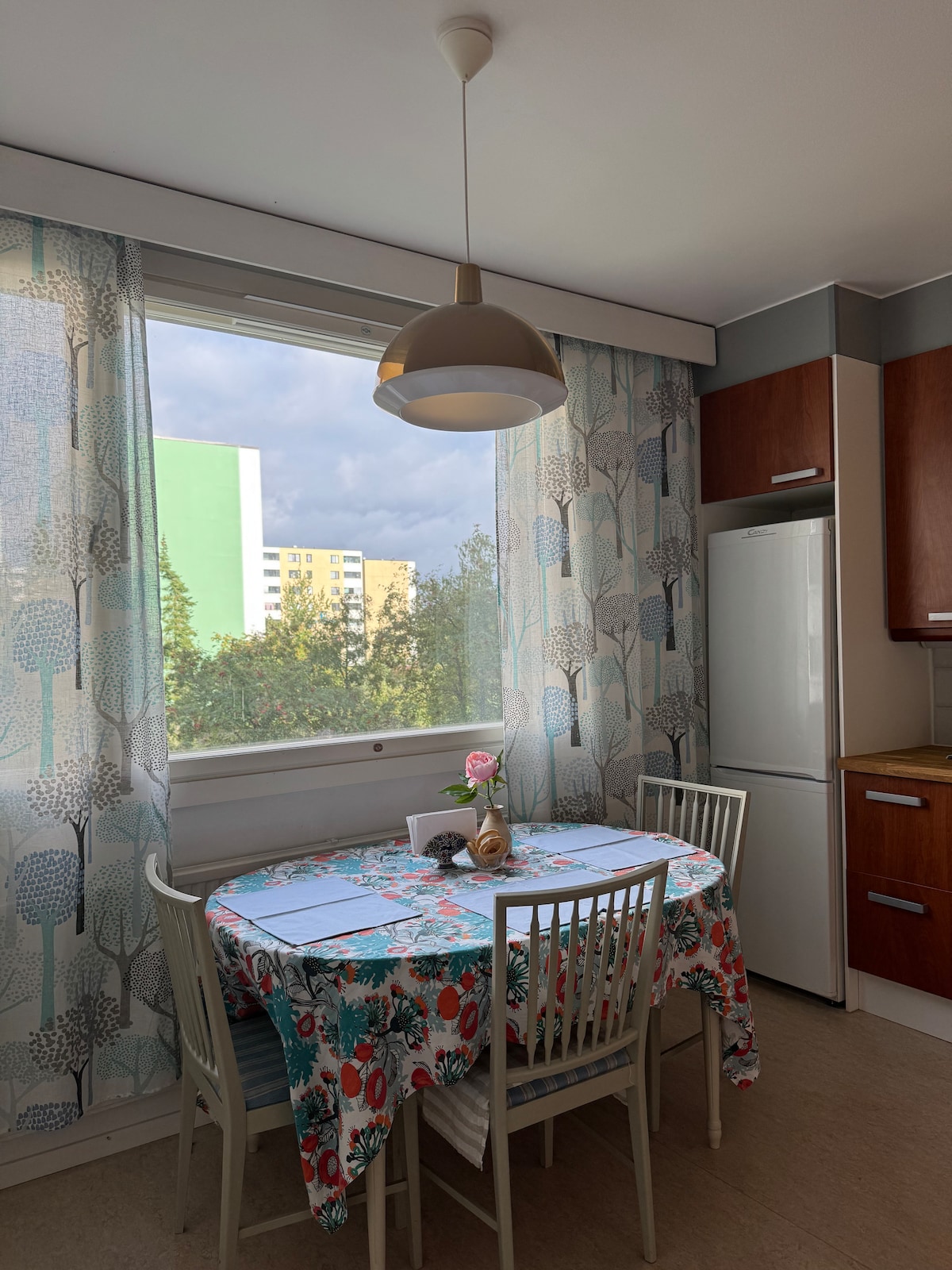 Apartamento de 49 m2 situado a 700 metros de la estación de tren (Leinelä). A una parada (3 minutos) del aeropuerto. Excelentes terrenos al aire libre y pistas de esquí abiertas desde la misma puerta. El campo de golf de frisbee Malminiity está cerca y las escaleras de fitness tampoco están muy lejos. Pizzería, R-kioski, farmacia y Alepa (tienda de alimentos) se encuentran a poca distancia a pie. El tren te llevará al corazón de Helsinki en unos 25 minutos. Relájate con toda la familia en este alojamiento familiar y tranquilo.