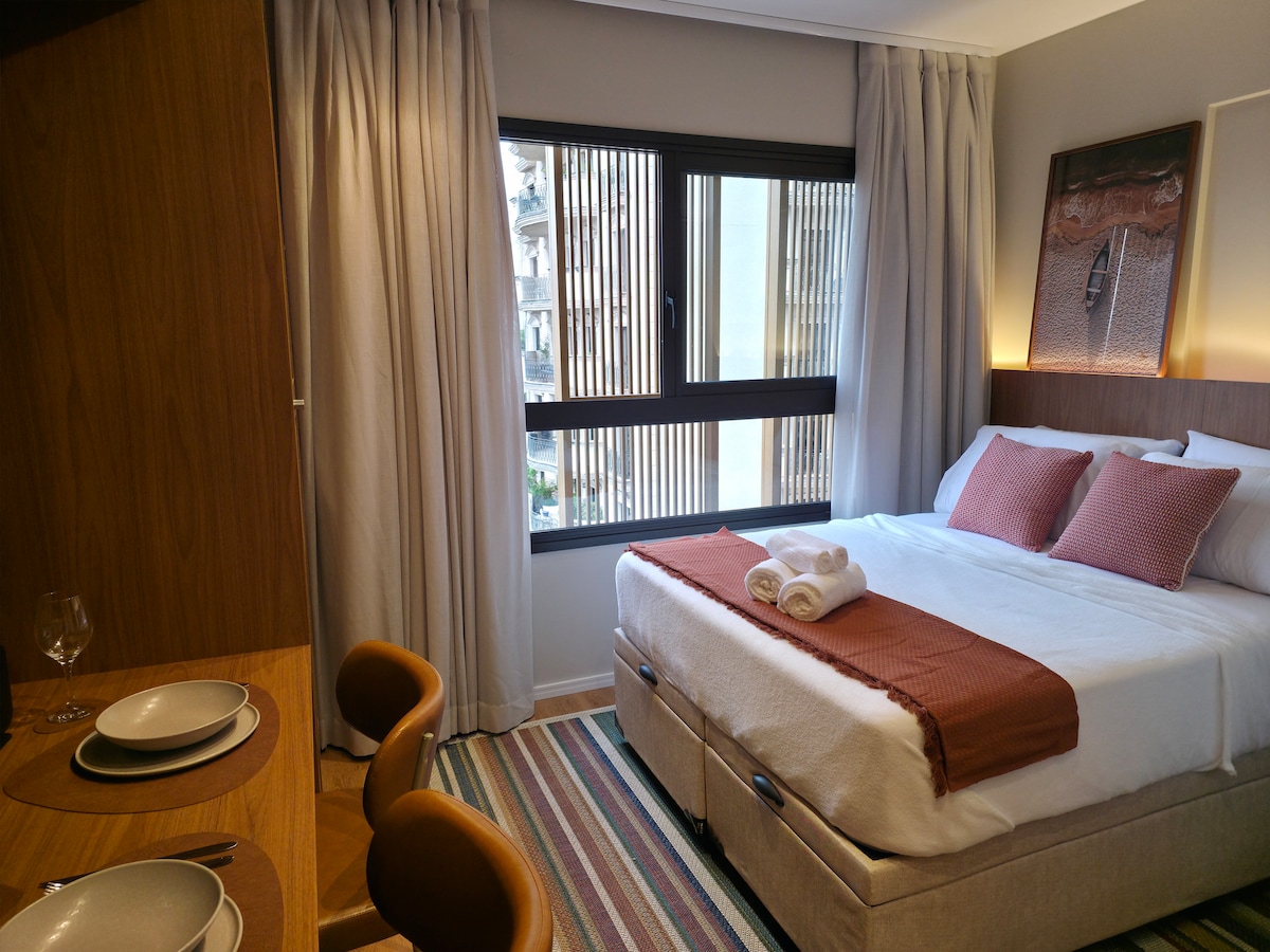 Estudio contemporáneo, impecablemente decorado y lleno de detalles sofisticados, ubicado en la zona más deseable de Moema, a solo 6 minutos a pie de la estación de Moema y a 900 metros del parque Ibirapuera. Un lugar ideal para parejas, viajeros solitarios o de negocios, que combina comodidad, estilo y practicidad. El estudio tiene una cama doble, un juego de cama Teka Profiline premium, aire acondicionado, wifi rápido, televisor inteligente de 50 pulgadas, cocina totalmente equipada y un baño refinado, toallas suaves y comodidades completas.