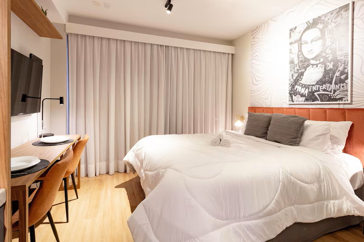 🏢 Estudio premium en Moema con diseño contemporáneo, a solo 1 cuadra del centro comercial Ibirapuera y a 5 minutos del parque Ibirapuera. ⭐ LO MÁS DESTACABLE: • Ubicación privilegiada: Moema de primer nivel • Televisión inteligente + Alexa + wifi de alta velocidad • Cocina totalmente equipada (freidora de aire, microondas, estufa). • Lavadora y secadora. • Aire acondicionado + balcón