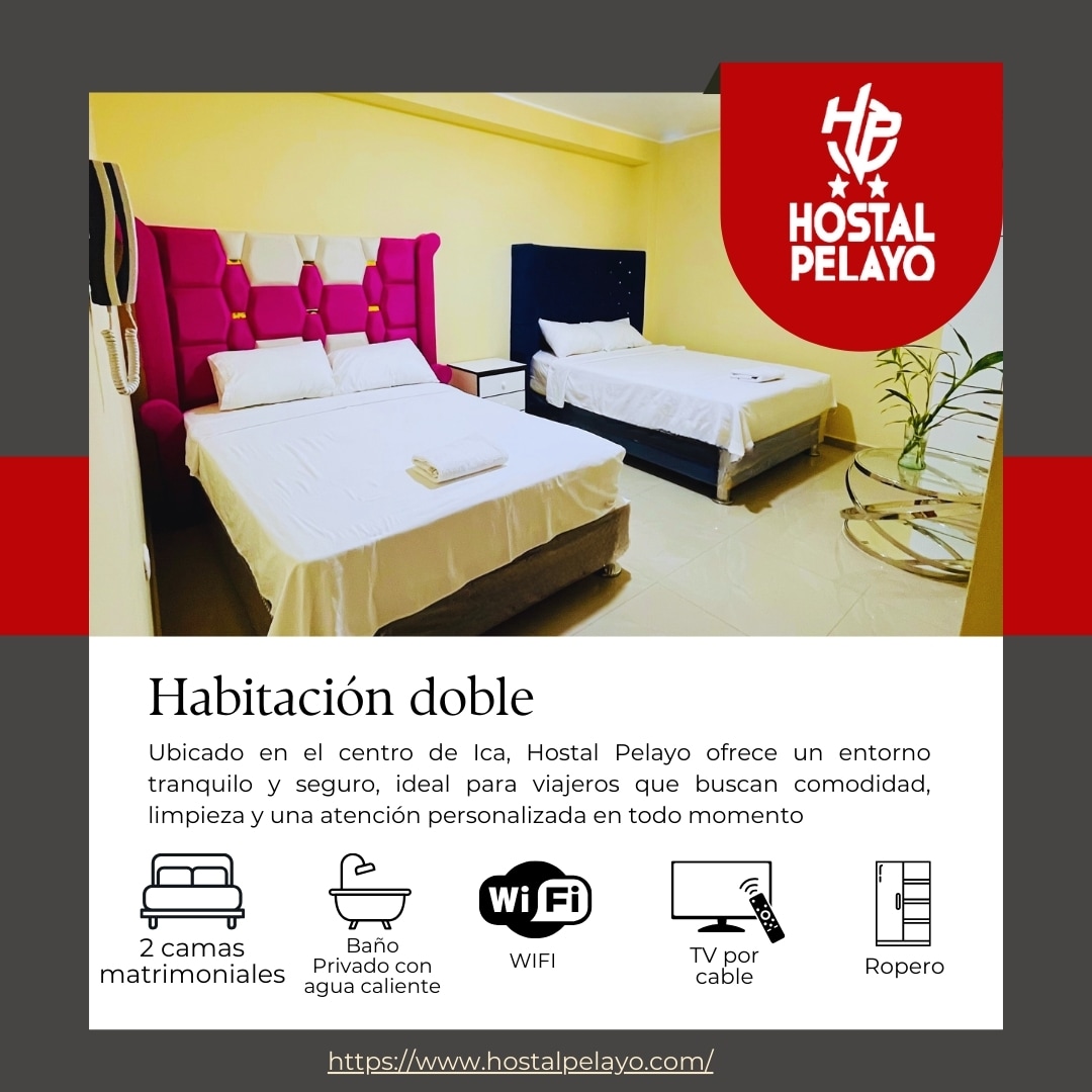 somos un alojamiento rústico muy hogareño diseñado para que estén como en casa. con instalaciones cómodas para que puedan disfrutar con seguridad. Somos pet friendly, tenemos terrazas con juegos de mesa, piscina con un bar para que puedan disfrutar de su estadía, estacionamiento y con fácil acceso a Huacachina a tan solo 2km, también mini marjet, farmacias, centro comercial mega plaza, hospital regional y puestos de comida al rededor de nuestro hotel variados para su elección.