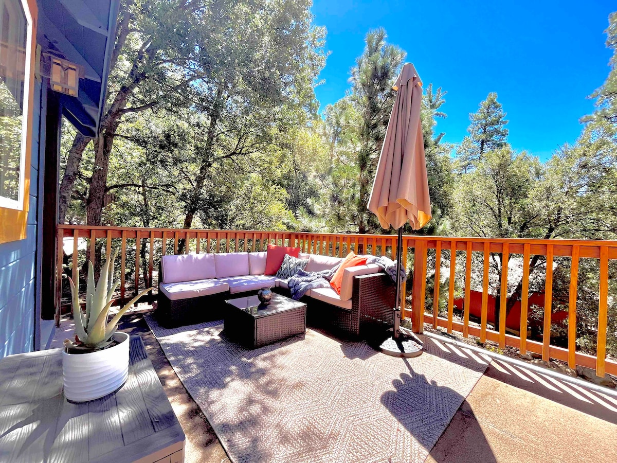 ¡Bienvenido a nuestro pedazo de paraíso entre pinos! Cabaña rústica y elegante recientemente renovada con muebles nuevos, ropa de cama orgánica, techos elevados de vigas de madera y numerosas ventanas. ¡Un verdadero sueño para los amantes de la naturaleza, relájate en la amplia terraza mientras disfrutas de impresionantes puestas de sol en las montañas! Acurrúcate junto al cálido fogón mientras disfrutas de la observación de aves durante el día y de las estrellas por la noche. La escalera de caracol conduce a nuestra característica favorita, el dormitorio loft con ventanas panorámicas y vistas a las copas de los árboles.