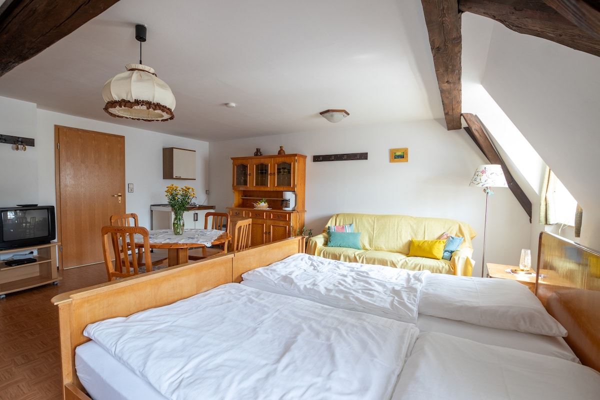 Nosotros, "ZurMelberi", vivimos en la zona recreativa "Lago de Franconia". Si te gusta la tranquilidad y quieres llegar rápidamente al paisaje del lago, estás en el lugar correcto. Nuestro pueblo pertenece a la ciudad de Spalt, a 7 km de distancia. El apartamento de vacaciones con aire acondicionado en el ático en diseño de estudio es adecuado para un máximo de 4 personas a partir de 18 años. Hay rutas directas de senderismo (entre otras, el Camino de Santiago) y ciclismo que parten de nuestra casa. El uso compartido de la piscina es posible en cualquier momento. Hay una terraza privada disponible.