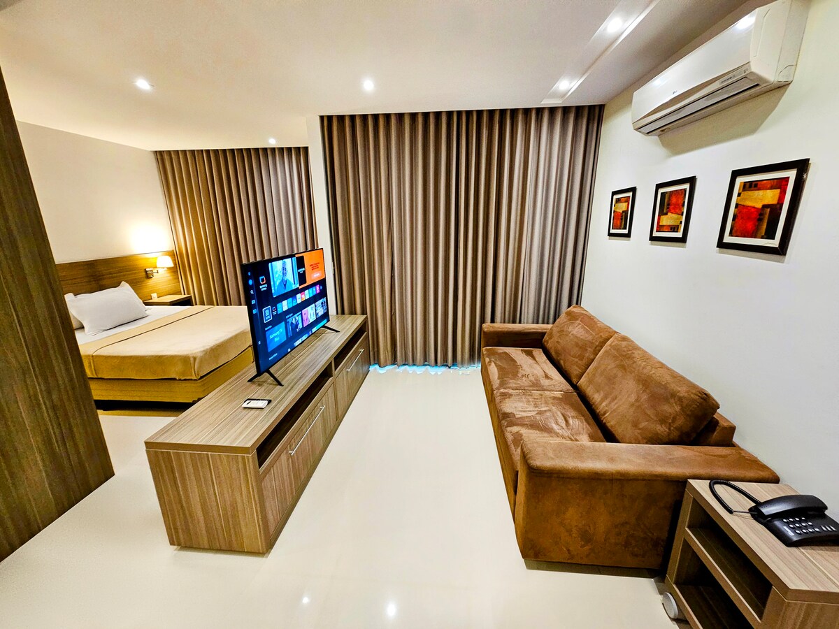 Moderno apartamento ubicado en el condominio Villa del Sol con exuberantes vistas a la playa de Macumba. Dormitorio y sala de estar con capacidad para 4 personas, cómoda cama queen y un sofá cama. Aire acondicionado y ventilador. Cocina completa y sala con smart TV y wifi. Piso ideal para parejas, familias pequeñas, viajes corporativos y amantes del surf. Piscina, sauna, hidromasaje, gimnasio, restaurante, sala de oficina en casa, sala de masajes, sala de video, seguridad las 24 horas, recepción las 24 horas, estacionamiento, tablón de surf