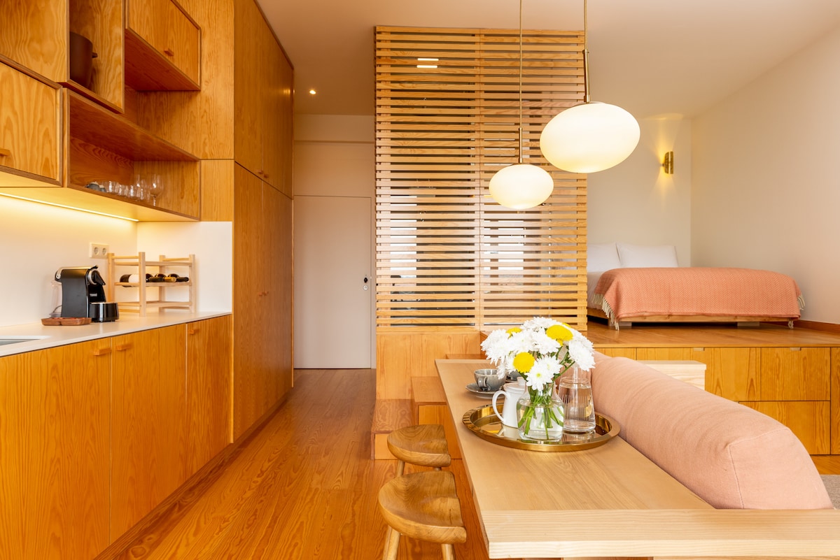 🌅 La experiencia Despierta con un amanecer dorado sobre la Catedral de Oporto y los tejados históricos. Disfruta tu café de la mañana en una terraza privada mientras la ciudad cobra vida lentamente. Después de un día explorando las calles históricas, regresa a tu tranquilo estudio y disfruta de una copa de vino de Oporto con impresionantes vistas panorámicas del casco antiguo y del río Duero. Este departamento boutique con terraza fue diseñado para viajeros que valoran la belleza, la comodidad, la privacidad, la historia y una ubicación inmejorable.