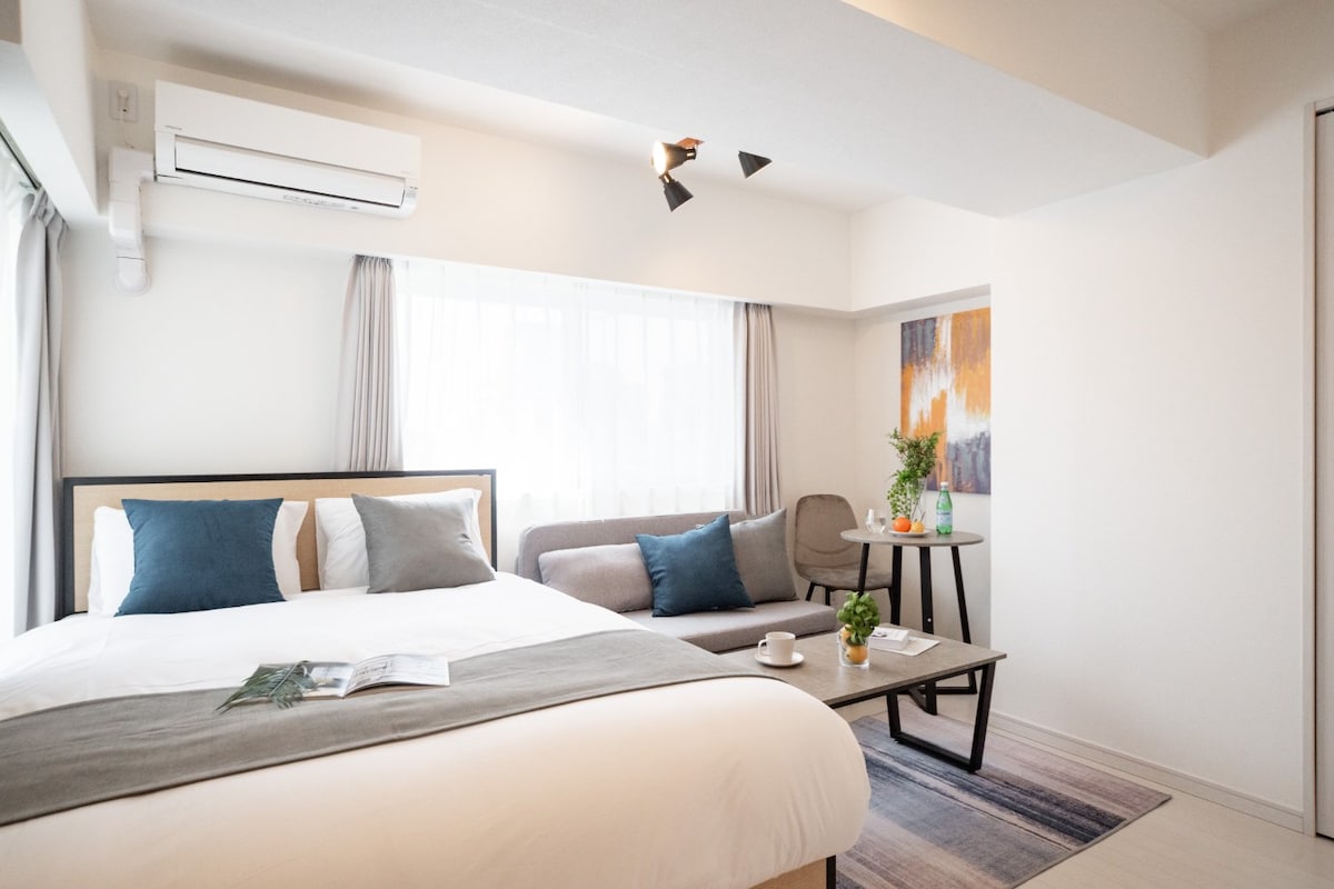 Just a 2-minute walk from the station, Palette House is a cozy and stylish retreat perfect for exploring Tokyo. The industrial-style kitchen includes an island bar, full cookware, wine glasses, and a water dispenser—ideal for cooking and evening drinks. The living room features natural driftwood décor and a comfy sofa, while the Japanese-modern bedroom offers a refined, relaxing space. With thoughtful amenities and warm design, it’s a perfect base for couples and families.