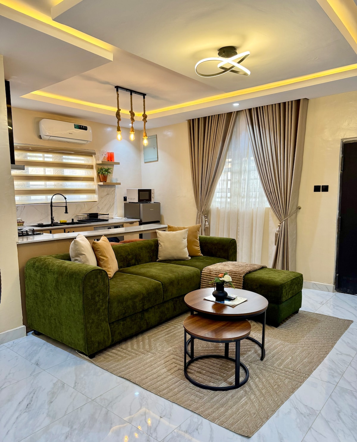 Te damos la bienvenida a nuestro alojamiento escandinavo Wabi-Sabi de un dormitorio en Opebi, Ikeja. Este sereno escondite combina un diseño minimalista, texturas naturales, vegetación exuberante y un acogedor espacio al aire libre. Disfruta de una zona de minigolf relajante, brisas frescas y naturaleza a tu alrededor. El dormitorio en suite cuenta con una cama tamaño king, cálidos tonos terrosos, una acogedora sala de estar con Netflix, conexión WiFi gratuita y una cocina totalmente equipada, todo en una comunidad cerrada a pocos minutos del aeropuerto y cerca de bancos, restaurantes y tiendas de comestibles.