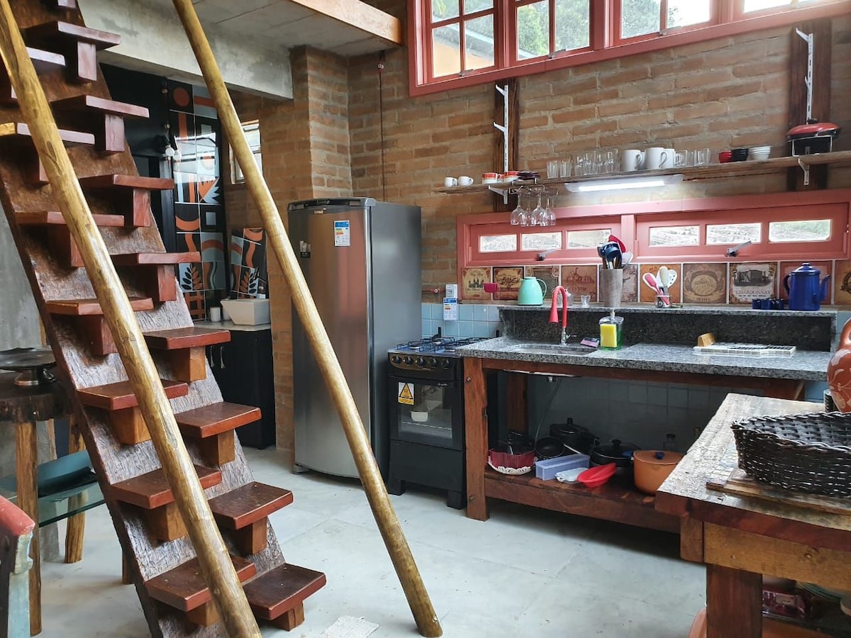 Um bangalô construído artísticamente em cada detalhe...banheira aberta para a mata com teto de vidro passam a sensação de estar imerso na natureza, com uma Figueira centenária de frente e muitos pássaros...intimista e acolhedor em conexão com a Natureza em contato com essa área de reserva da Mata Atlântica. O outro chuveiro quente fica no deck aberto para a mata e é delicioso de dia ou à noite com céu de estrelas e Luar.
