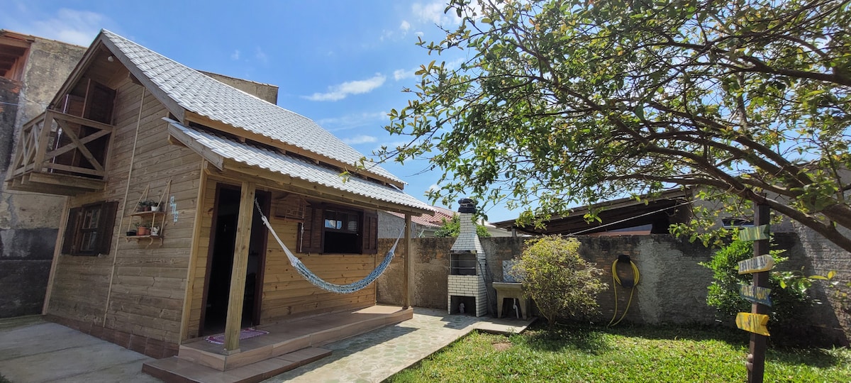 Acogedor chalé para hasta 3 personas, serían dos adultos y un niño con terraza y parrilla frente al jardín. Cocina completa con freidora de aire, cama doble y sofá cama con ropa de cama incluida. Cuenta con aire acondicionado frío y caliente, TV y secador de pelo. Situado en una tranquila región familiar, a 100 metros de la laguna de Ibiraquera, a 4 km del centro de Rosa, Barra da Ibiraquera y Praia do Luz. ¡Fácil acceso y zona tranquila!