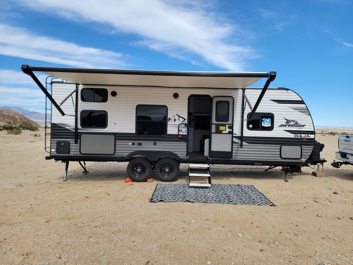 Acurrúcate en esta pequeña casa rodante, perfecta para la Bienal o cualquier visita improvisada a Bombay Beach. Nota: La propiedad es un trabajo constante en progreso; la estoy expandiendo/construyendo continuamente, por lo que este anuncio seguirá evolucionando con nuevas ofertas. El Jaybird es solo para un viajero solitario o una pareja. Tengo agua conectada a la propiedad, pero no electricidad. Por lo tanto, esto es ideal si buscas un paso por encima de acampar. Sin embargo, te damos la bienvenida a la ciudad, ¡esto es de lo que se trata!