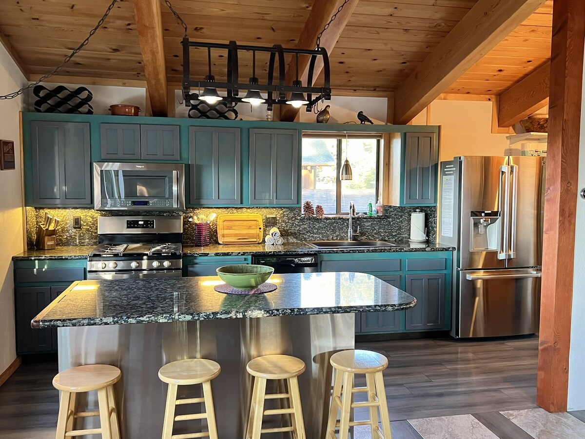 This is our Holiday Home and we just love the vaulted ceiling in the living area , it has a panoramic view of the Lake and you will find yourself just staring at the Lake Sunsets and Star filled Night Sky. It is a well appointed space with lots of unique artwork and a running theme of Bears and the Lake Life. You can see the lake from each Bedroom and it is very peaceful at the Bitterbrush Complex. In the Summer you are close to amazing Beaches , and in Winter the Ski Slopes are right there.