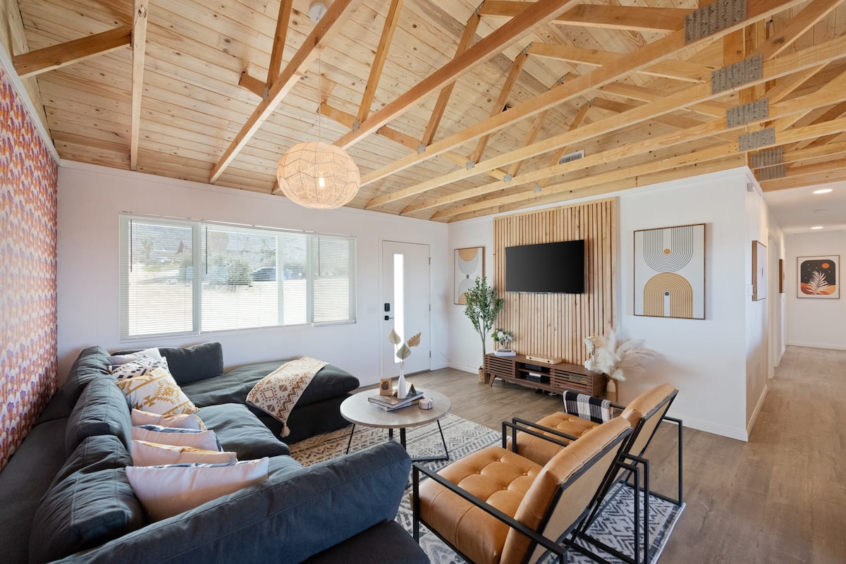 Alójese en esta casa privada de 4 dormitorios y 2 baños en el desierto de Joshua Tree, con bañera de hidromasaje y fogón, a solo 9 minutos del Parque Nacional Joshua Tree. Capacidad para 8 personas con sala de juegos, cancha de bochas, hamacas, comedor al aire libre con parrilla, patio trasero vallado, cocina completa, sábanas de primera calidad, aire acondicionado y conexión wifi. Ideal para familias, cerca de restaurantes, tiendas y el Saloon del centro de Joshua Tree.