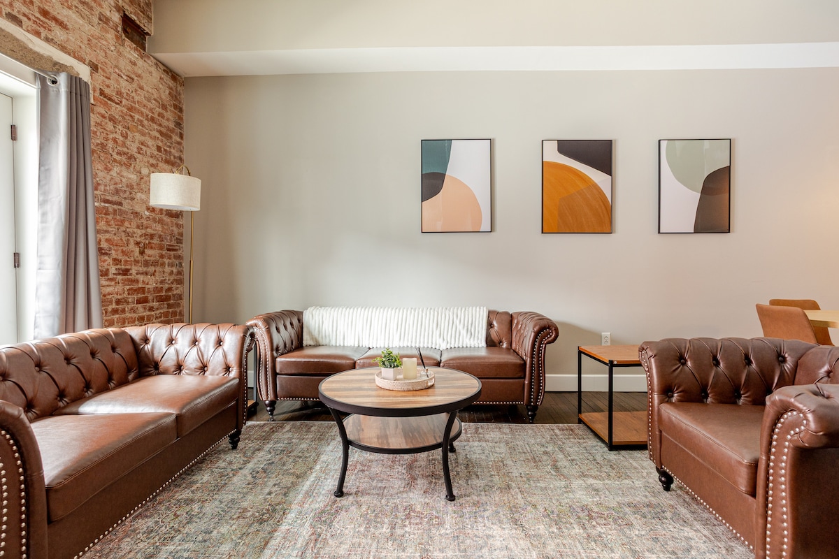 Welcome to McOuat Place, your stylish urban loft in the heart of downtown Indianapolis. Step into an exceptionally spacious apartment where modern design meets classic comfort. Exposed brick walls and comfortable leather sofas create a warm, inviting atmosphere perfect for relaxing after a day of exploring the city. You are perfectly positioned to experience the best of Indy. Located in the heart of downtown, you are just steps away from the city's top attractions, dining, and entertainment.