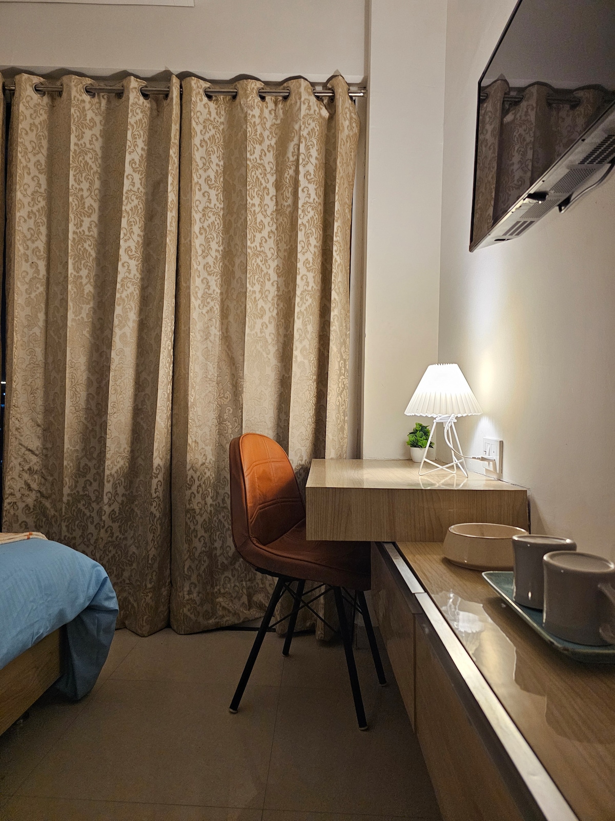 Independent 1 BHK Luxurious service apartment with TWO Split AC, Smart TV with almost all OTT including Netflix, Amazon Prime, ZEE5, Hotstar, Voot, Sony Live. Wardrobes Sofaset, Dining space, working Kitchen, Fridge, Microwave Gas Chimney e.t.c A vey safe and secure place for women. Gated and guarded society. Have fun with the whole family or Alone at this stylish place. Bisleri drinking water included in price 100MBPS WiFi installed All toiletries are included High Grade Quilt used